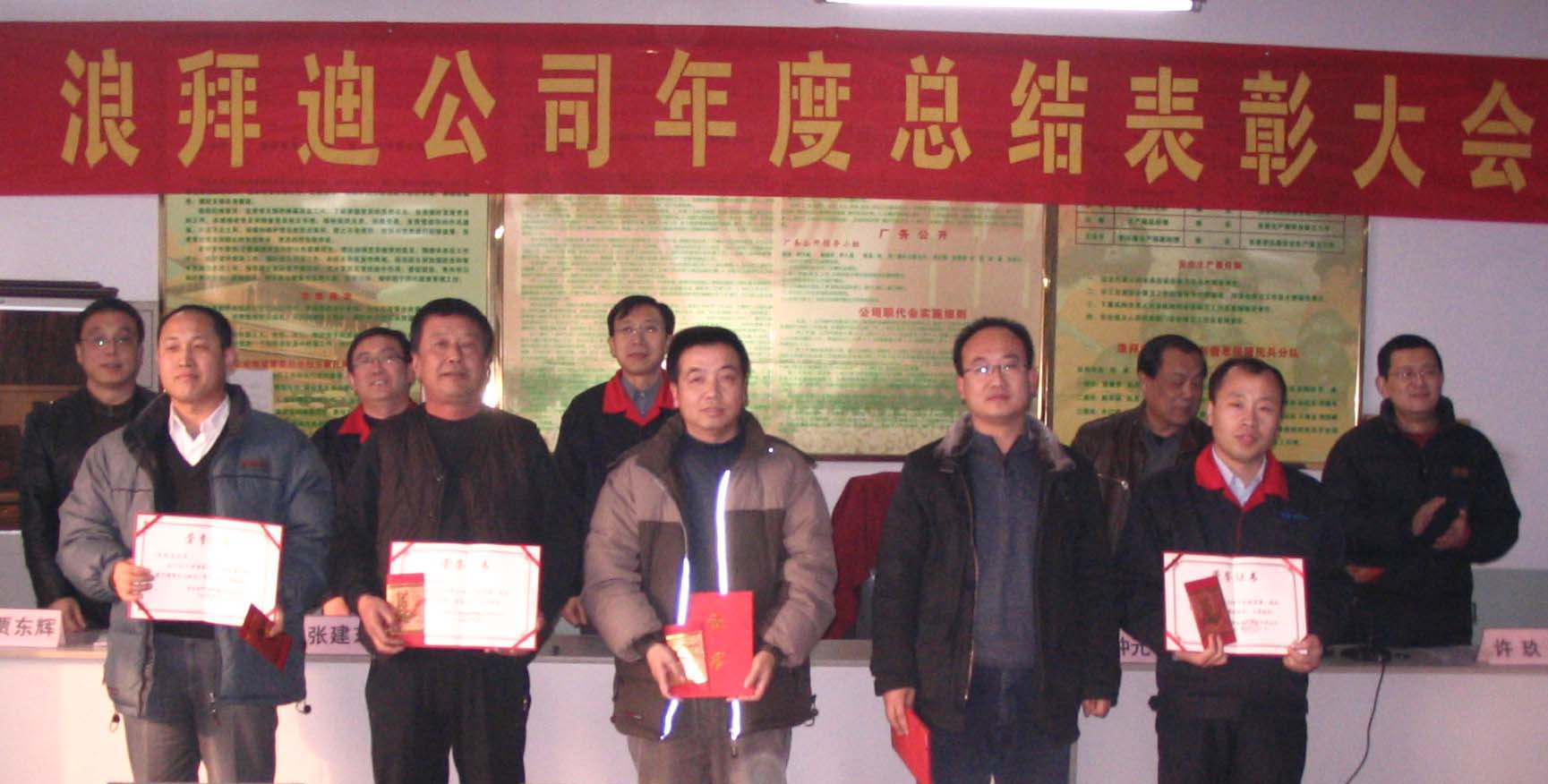 “金牛送福绿柳迎春,鼓乐和鸣龙狮劲舞。”在春节即将到来之际浪拜迪全体员工召开了年度总结表彰大会。2009年1月21日下午三点,全体员工准时到达四楼职工之家。大会第一项公司董事、人力资源总监公布08年度公司获得的荣誉称号,通报08年度公司奖惩情况。经统计2008年全年公司共获得国家、省、市、区年度受表彰奖励的优秀员工名单,他们分别是销售状元杨建亮;回款状元周京魁;服务状元王耀辉,全年服务效率高;优秀员工两名,分别是赵占磊和唐艳生。当选为优秀团队的两个部门是采购部和财务级的荣誉14项,两人获得个人荣誉。全年共奖励5次,处罚1次。第二项由公司董事、总工程师公布2008部。之后公司董事会成员向受表彰的团队、个人颁发奖状、证书和奖金。
